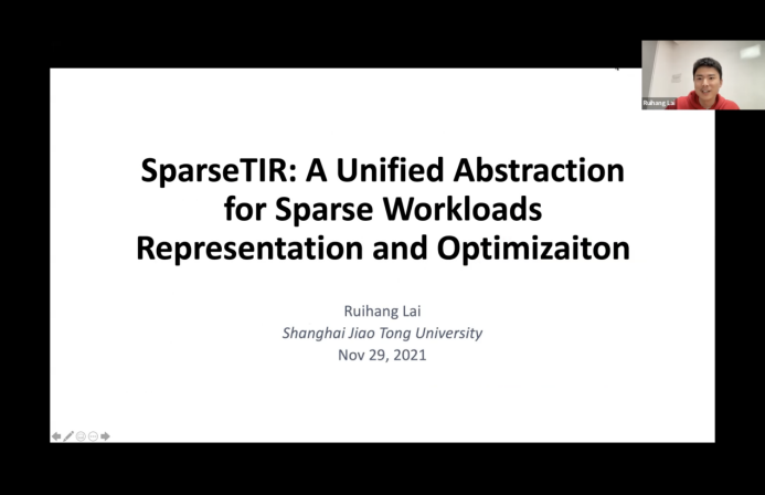 除了工作本身,学术交流活动上也少不了赖睿航的身影。2021年12月,赖睿航分别在卡内基梅隆大学Catalyst科研组和第四届TVM深度学习编译器大会上做学术报告,介绍稀疏张量算子优化工作。2022年1月,他又在华盛顿大学SAMPL实验室介绍自己课题组为深度学习算子所搭建的自动优化架构。通过这三次学术报告的机会,赖睿航得以充分与领域内的其他学生、老师进行交流,对这些课题的以及领域未来的发展进行了充分的讨论。