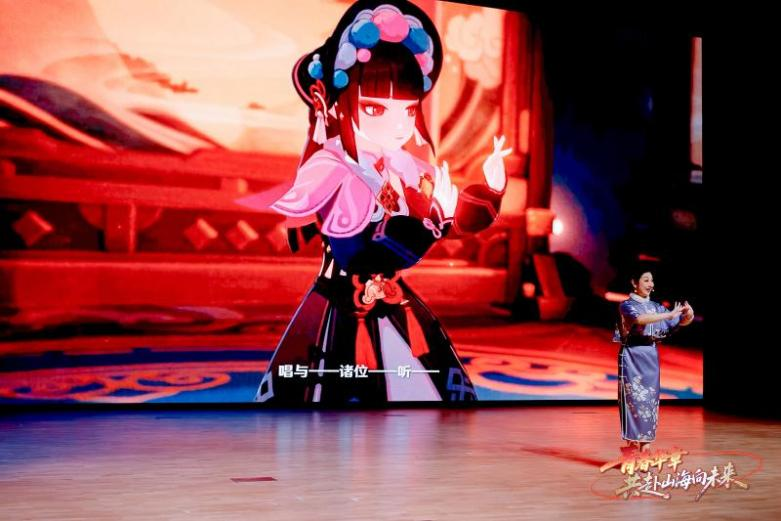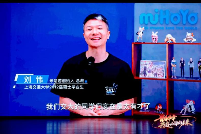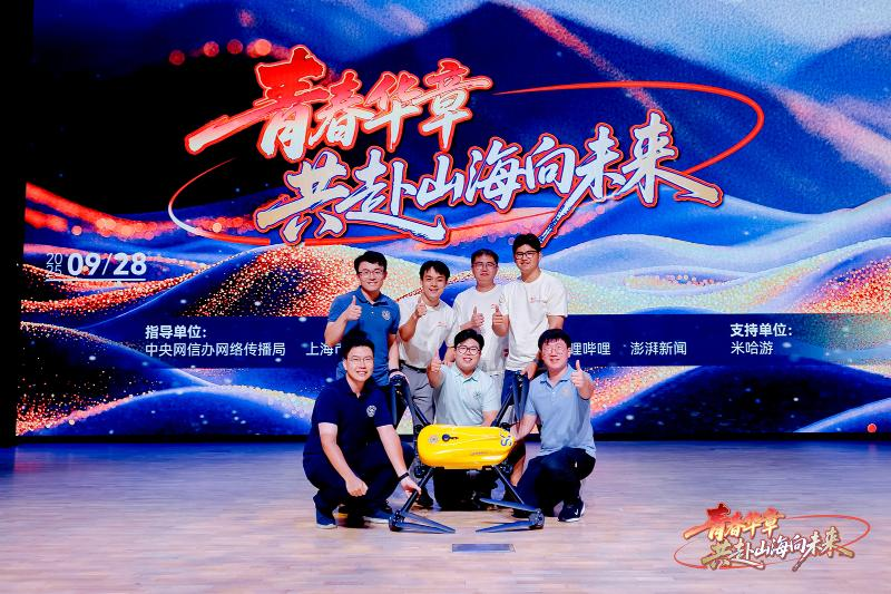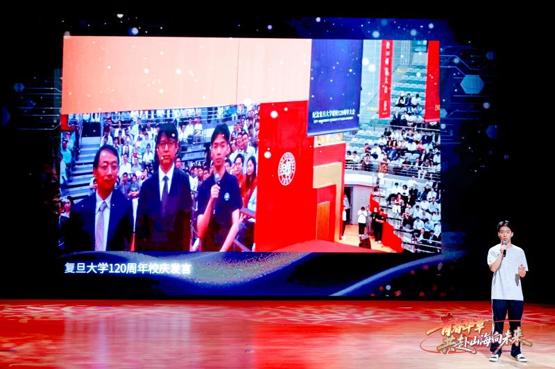 第三篇章“追梦·未来之约”展望未来。青年交警黄俊、上海创智学院和复旦大学联合培养博士生王殿仪、派生万物 CEO孙挥以行动诠释“我辈当为、强国有我”的时代担当。上海交大团队研发的海空两栖无人航行器“哪吒”也来到展演现场,三位交大学子以脱口秀形式幽默分享了“哪吒”科研的背后故事,台上台下欢乐互动。当上海交通大学2012届硕士毕业生,米哈游创始人、总裁刘伟的视频出现在大屏幕上时,交大学子一片欢呼。上海京剧院青年演员杨扬演唱的《原神》游戏配曲《神女劈观》,原汁原味的京剧唱腔和二次元的混搭在活动现场掀起一个高潮。